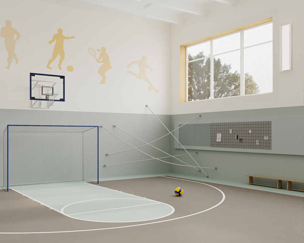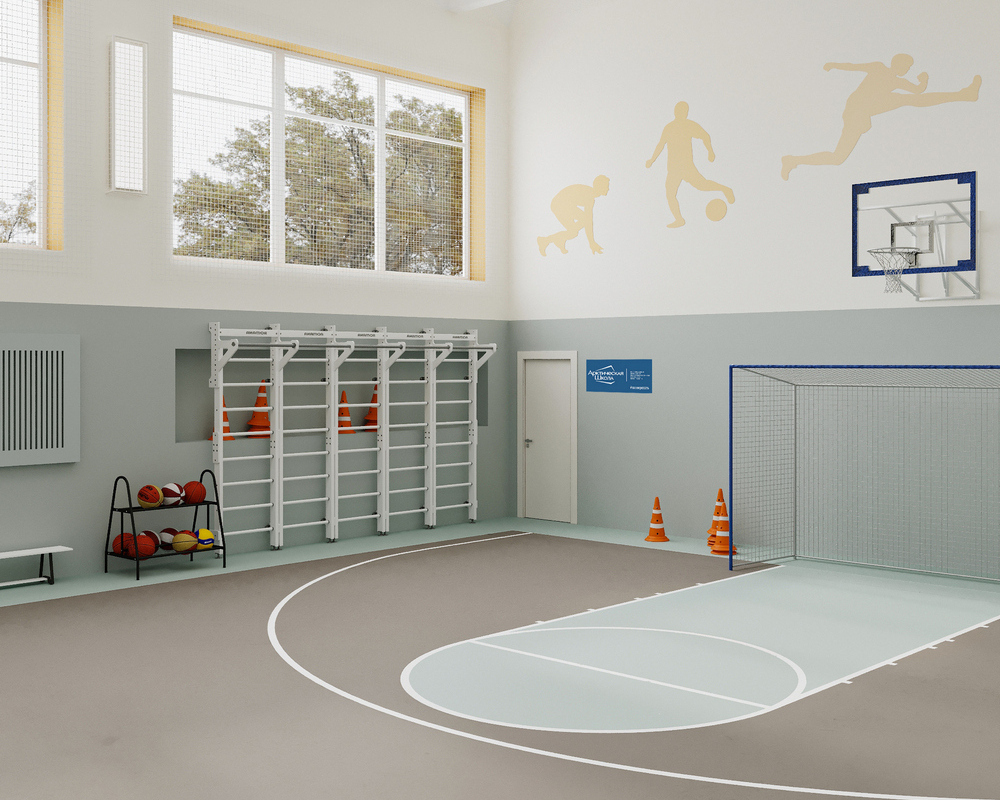 При разработке дизайн-проекта и оформлении спортзала в школе мы используем только прочные, износостойкие и безопасные материалы.