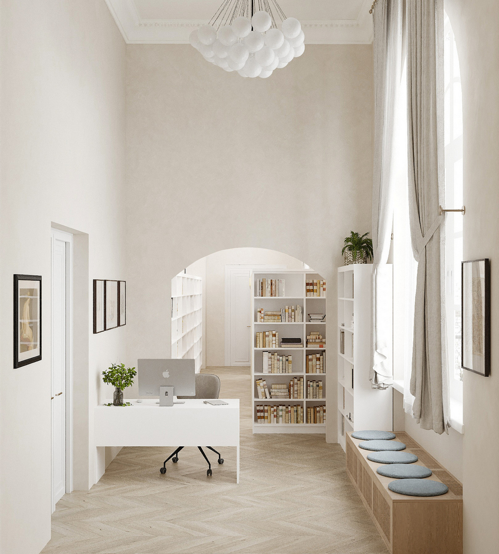 Проект оформления библиотеки может включать (и практически всегда включает) организацию беспроводных Wi-Fi сетей и установку персональных компьютеров. Это помогает гостям пользоваться интернетом во время посещения, а персоналу облегчит коммуникацию. Чтобы в оформлении читального зала библиотеки чувствовалась элегантность и величие, мы стараемся сохранить прежний стиль. Здесь мы делаем акценты на декор. Дерево, камень, люстры и настольные лампы прекрасно передают дыхание эпохи. Разделение рабочих мест мобильными перегородками и высокими шкафами помогает эффективнее организовать пространство, создать комфортные условия для работы, не проводя конструктивных изменений интерьера.