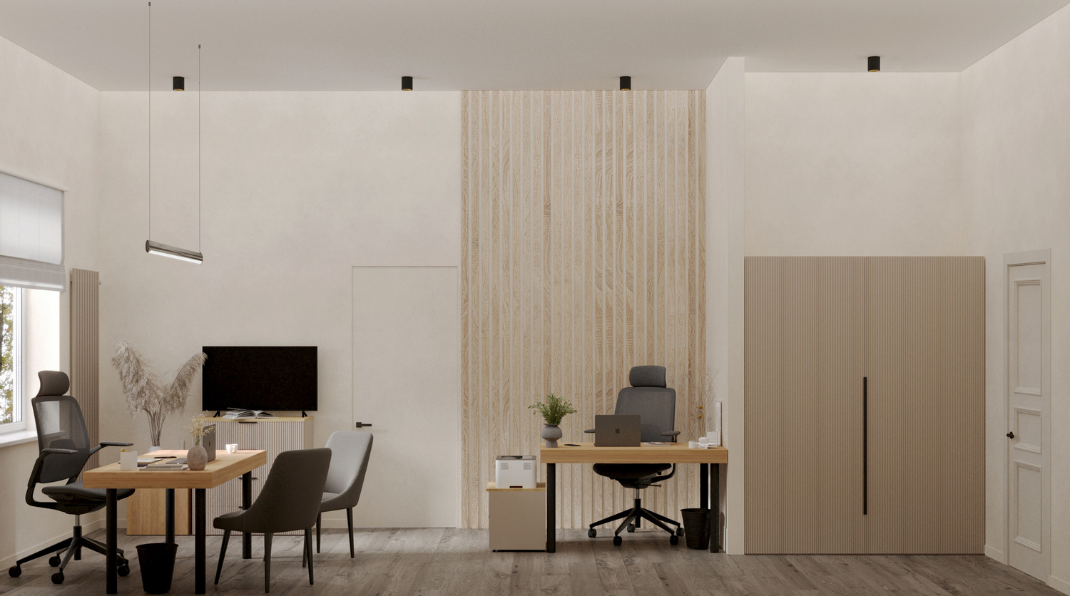 В дизайн-проект кабинета директора включаем узнаваемый логотип компании. Это подчеркивает статус и значимость должности. Мы понимаем, что каждый человек индивидуален, поэтому учитываем и личные предпочтения руководителя.